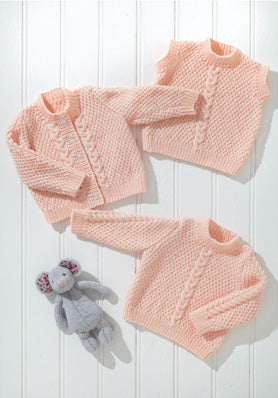UKHKA276 –  Pattern for babies This beautiful leaflet pattern gives instructions for knitting a cardigan, sweater and slipover for babies with ches...