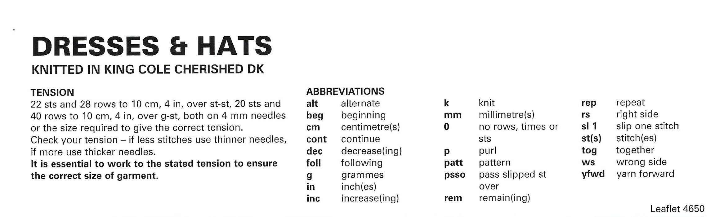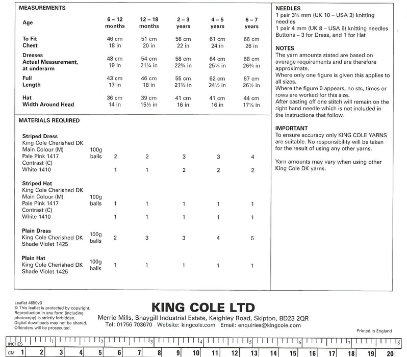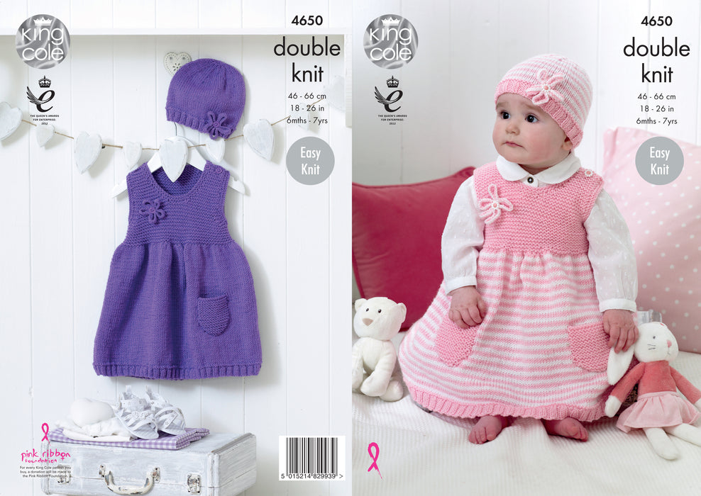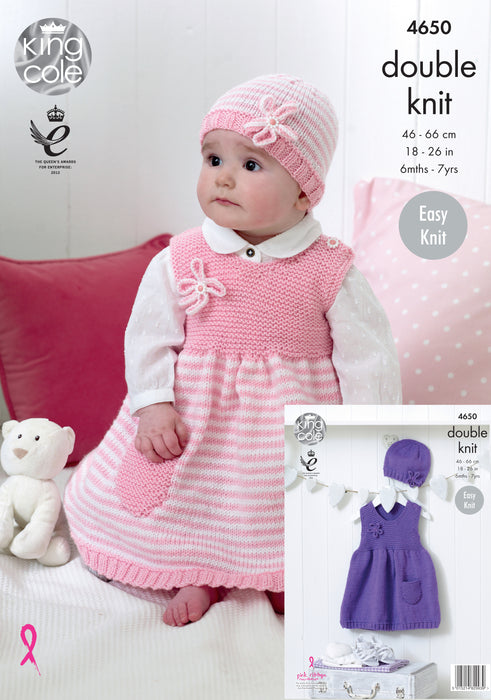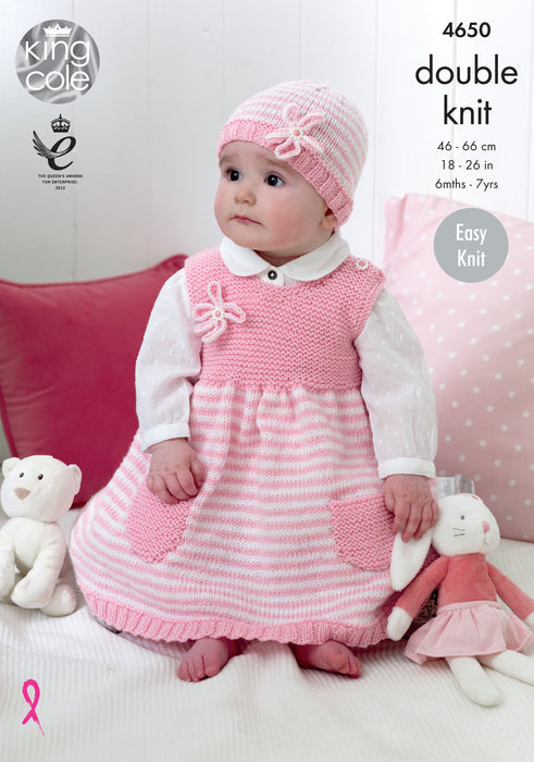 King Cole 4650 Double Knitting Pattern - Easy Knit - DK Baby Children's Dresses & Hat